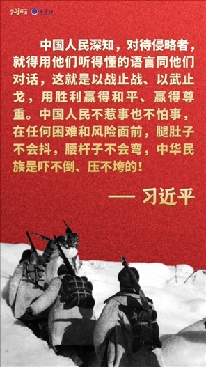 偉大抗美援朝精神跨越時空、歷久彌新。我們要銘記抗美援朝戰(zhàn)爭的艱辛歷程和偉大勝利,敢于斗爭、善于斗爭,知難而進、堅韌向前,把新時代中國特色社會主義偉大事業(yè)不斷推向前進。