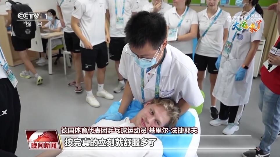 德國(guó)體育代表團(tuán)乒乓球運(yùn)動(dòng)員 基里爾·法捷耶夫:真的太舒服了。剛才醫(yī)生按了幾個(gè)穴位,有點(diǎn)疼,但是很快就感覺超級(jí)輕松,按完真的立刻就舒服多了。
