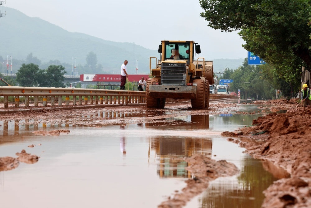 7月31日,在河北省石家莊市井陘縣307國道長崗村段,防汛工作人員駕駛機(jī)械清理淤泥。新華社發(fā)(梁子棟攝)
