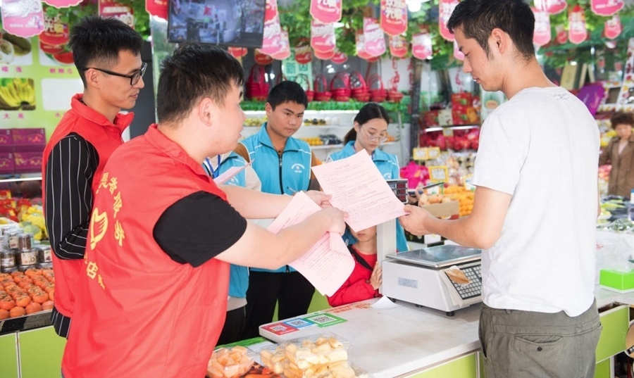 浙江省湖州市吳興區(qū)八里店鎮(zhèn)結(jié)合主題教育和“三服務(wù)”,推進(jìn)“民生大走訪”工作機(jī)制,全體網(wǎng)格員下沉村、社一線,了解社情民意,化解矛盾糾紛,服務(wù)村社群眾。這是八里店鎮(zhèn)中心片區(qū)網(wǎng)格員(藍(lán)衣者)和志愿者(紅衣者)對(duì)一家店鋪進(jìn)行平安問卷調(diào)查(2019年10月31日攝)。新華社記者 翁忻旸 攝