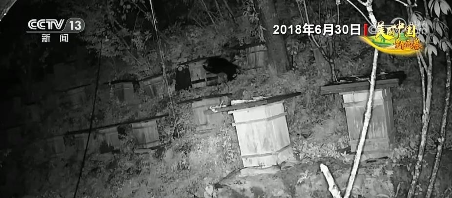 在湖北堵河源國家級自然保護區(qū),經常會發(fā)生黑熊下山偷食百姓的莊稼、蜂蜜等農產品。記者通過當地一位村民提供的視頻看到,2018年晚上一頭成年黑熊來到一蜂箱放置點,黑熊為了取食蜂蜜推倒了一箱蜂箱,并啃食了幾口蜂蜜。