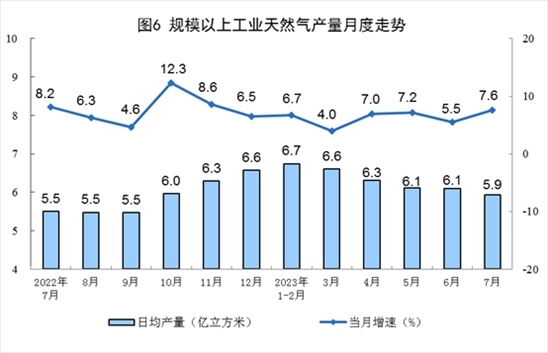天然氣生產(chǎn)加快,進口較快增長。7月份,生產(chǎn)天然氣184億立方米,同比增長7.6%,增速比6月份加快2.1個百分點,日均產(chǎn)量5.9億立方米。進口天然氣1031萬噸,同比增長18.5%,增速比6月份放緩1.1個百分點。