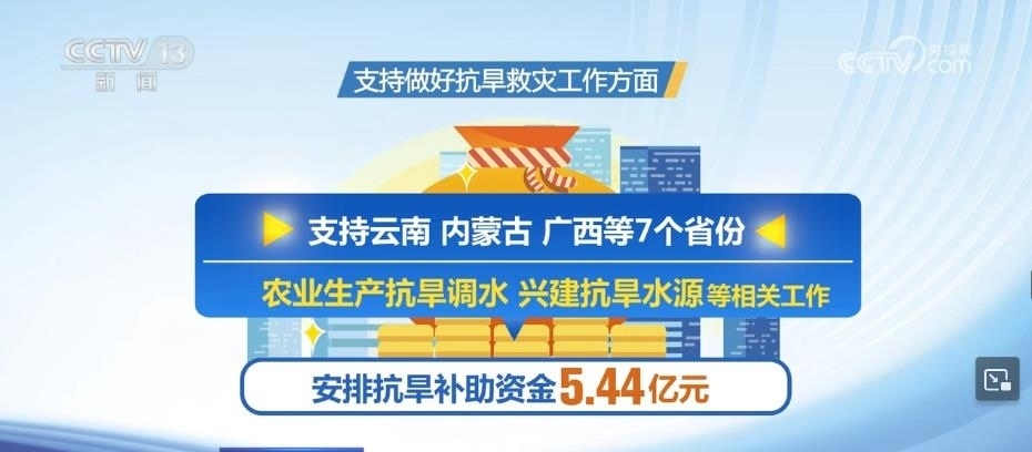 在支持做好抗旱救災工作方面,安排抗旱補助資金5.44億元,支持云南、內(nèi)蒙古、廣西等7個省份,開展農(nóng)業(yè)生產(chǎn)抗旱調(diào)水、興建抗旱水源等相關(guān)工作。 ?