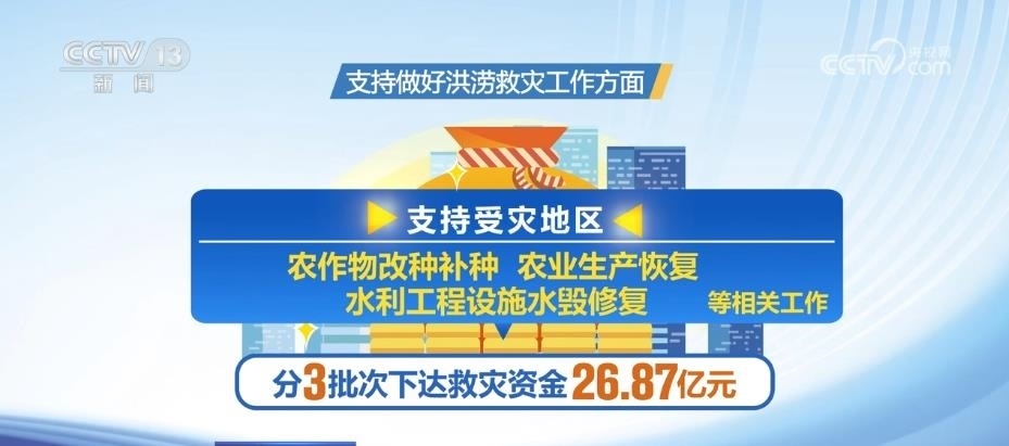 在支持做好洪澇救災工作方面,分3批次下達救災資金26.87億元,支持受災地區(qū)開展農(nóng)作物改種補種、農(nóng)業(yè)生產(chǎn)恢復、水利工程設施水毀修復等相關(guān)工作。
