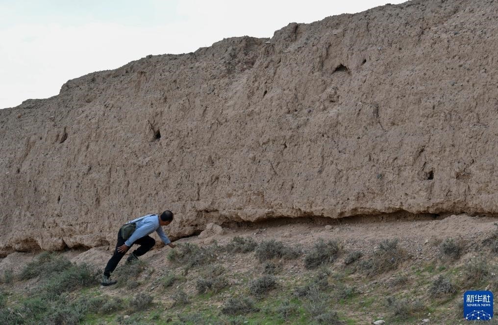 8月20日,董海寧觀察長(zhǎng)城墻體情況。新華社記者 劉金海 攝