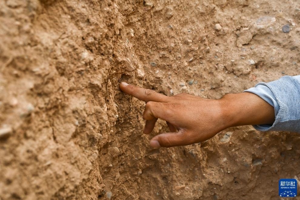 8月20日,董海寧介紹長(zhǎng)城墻體修建時(shí)用到的芨芨草。新華社記者 劉金海 攝