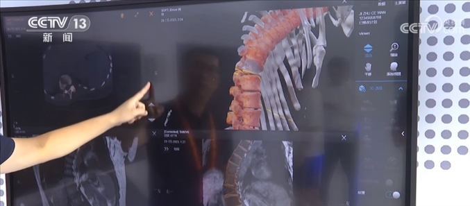 總臺(tái)記者 王豐:這里主要呈現(xiàn)的是一個(gè)智能手術(shù)室的系統(tǒng),這是一套幫助醫(yī)生進(jìn)行精準(zhǔn)手術(shù)計(jì)劃的設(shè)備,比如說(shuō)我們可以利用一張X光片,一張CT或者一張核磁影像,就可以還原出一個(gè)3D的影像,醫(yī)生通過(guò)3D的建模,可以精準(zhǔn)地看到病灶所在的位置,包括他如何下刀,來(lái)精準(zhǔn)地制定手術(shù)計(jì)劃。