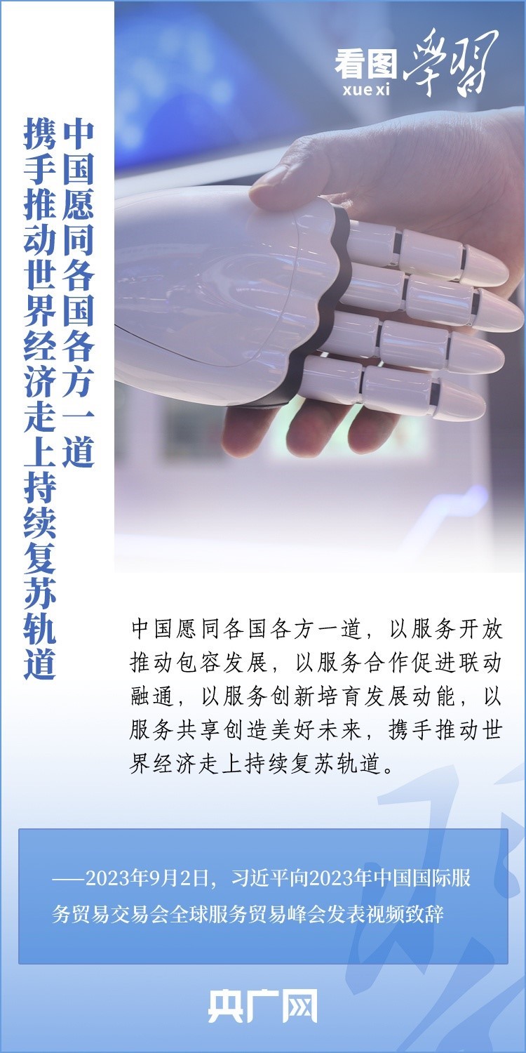 9月2日上午,以“開放引領(lǐng)發(fā)展 合作共贏未來”為主題的2023年中國國際服務(wù)貿(mào)易交易會在北京舉行。國家主席習(xí)近平向2023年中國國際服務(wù)貿(mào)易交易會全球服務(wù)貿(mào)易峰會發(fā)表視頻致辭表示,中國愿同各國各方一道,攜手推動世界經(jīng)濟(jì)走上持續(xù)復(fù)蘇軌道。一起來學(xué)習(xí)!