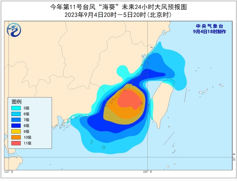 大風預報:9月4日20時至5日20時,臺灣海峽、東海西南部、南海東北部以及福建沿海、廣東中東部沿海、臺灣島西部和北部沿海將有6-8級、陣風9-10級大風,部分海域或地區(qū)的風力有9-11級,陣風12-13級。