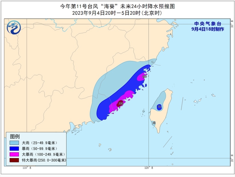 降水預報:9月4日20時至5日20時,福建大部、廣東東部、江西東南部、浙江東南部、臺灣島西部等地部分地區(qū)有大到暴雨,其中,福建東部、廣東東南部等地部分地區(qū)有大暴雨,局地特大暴雨(250-300毫米)。上述部分地區(qū)伴有短時強降水(最大小時降雨量30-50毫米,局地可超過70毫米),局地有雷暴大風等強對流天氣。
