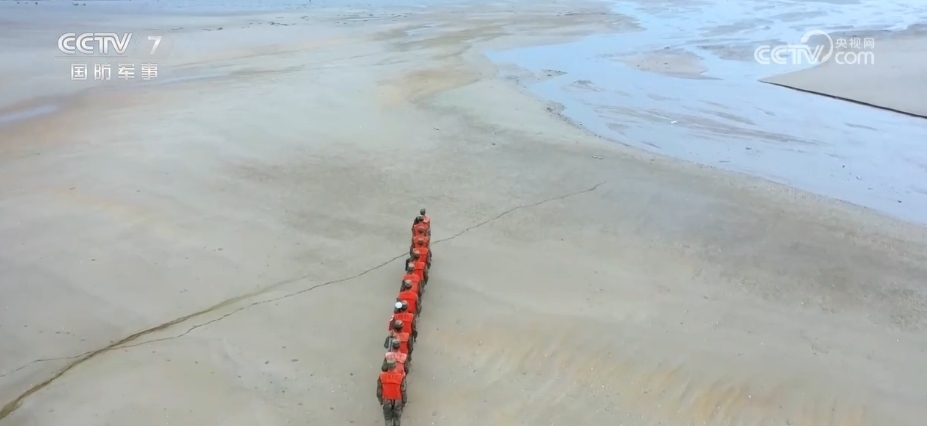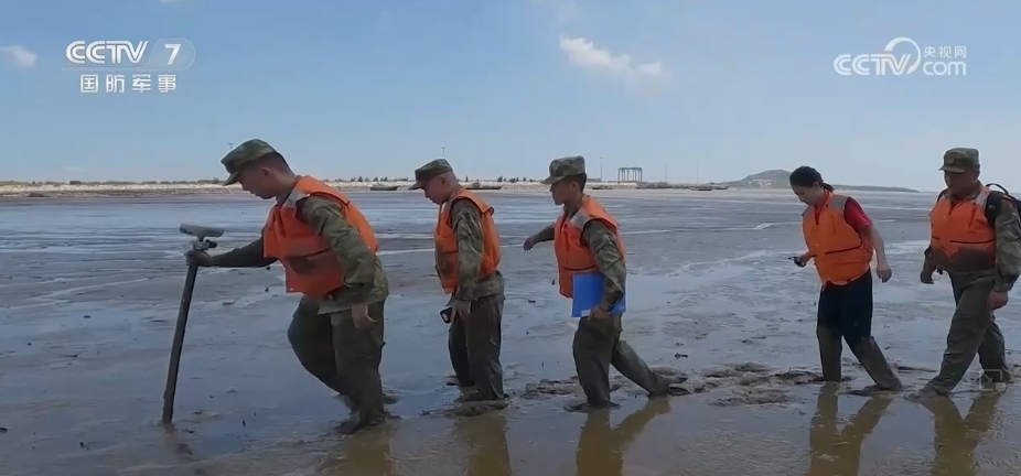 幸運的是,記者跟隨采訪的這次任務(wù)沒有遭遇到大風浪,經(jīng)過1個小時的平穩(wěn)航行后,海測小分隊順利抵達了坐標方位。指揮員告訴記者,海測分為水深測量和地形測量,為了讓海圖上陸海結(jié)合部的拼接更加完美,海測兵們必須要背著沉重的測量裝備深入到小艇不能到達的岸線灘涂手動測繪,測量點位附近大大小小的礁石,在海水的長期浸泡下變得異常濕滑,泥濘的淺灘也隨時有塌陷的危險。