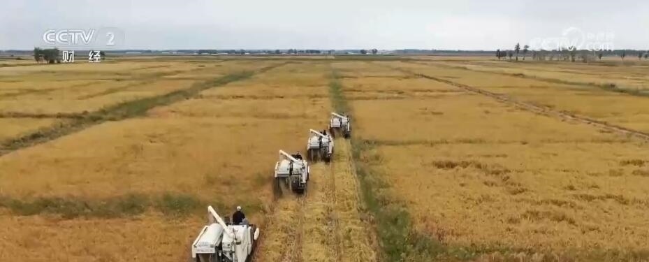 在農(nóng)安縣開安鎮(zhèn)的稻田里,幾臺大型收割機(jī)編組作業(yè),往來穿梭在稻田里收割稻谷。