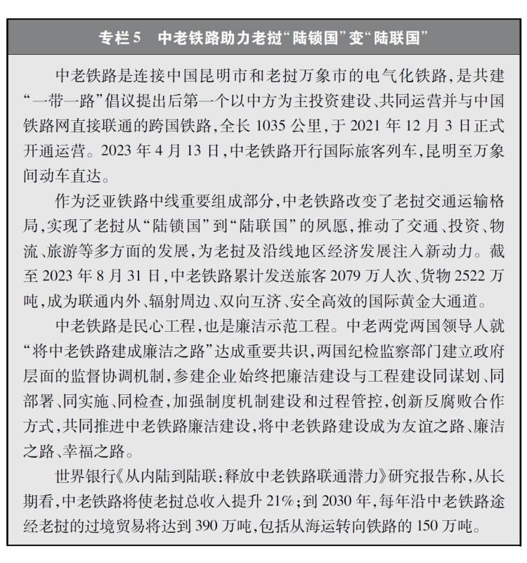 經(jīng)濟(jì)走廊和國際通道建設(shè)卓有成效。共建國家共同推進(jìn)國際骨干通道建設(shè),打造連接亞洲各次區(qū)域以及亞歐非之間的基礎(chǔ)設(shè)施網(wǎng)絡(luò)。中巴經(jīng)濟(jì)走廊方向,重點(diǎn)項(xiàng)目穩(wěn)步推進(jìn),白沙瓦-卡拉奇高速公路(蘇庫爾至木爾坦段)、喀喇昆侖公路二期(赫韋利揚(yáng)-塔科特段)、拉合爾軌道交通橙線項(xiàng)目竣工通車,薩希瓦爾、卡西姆港、塔爾、胡布等電站保持安全穩(wěn)定運(yùn)營,默拉直流輸電項(xiàng)目投入商業(yè)運(yùn)營,卡洛特水電站并網(wǎng)發(fā)電,拉沙卡伊特別經(jīng)濟(jì)區(qū)進(jìn)入全面建設(shè)階段。新亞歐大陸橋經(jīng)濟(jì)走廊方向,匈塞鐵路塞爾維亞貝爾格萊德-諾維薩德段于2022年3月開通運(yùn)營,匈牙利布達(dá)佩斯-克萊比奧段啟動(dòng)軌道鋪設(shè)工作;克羅地亞佩列沙茨跨海大橋迎來通車一周年;雙西公路全線貫通;黑山南北高速公路順利建成并投入運(yùn)營。中國-中南半島經(jīng)濟(jì)走廊方向,中老鐵路全線建成通車且運(yùn)營成效良好,黃金運(yùn)輸通道作用日益彰顯;作為中印尼共建“一帶一路”的旗艦項(xiàng)目,時(shí)速350公里的雅萬高鐵開通運(yùn)行;中泰鐵路一期(曼谷-呵叻)簽署線上工程合同,土建工程已開工11個(gè)標(biāo)段(其中1個(gè)標(biāo)段已完工)。中蒙俄經(jīng)濟(jì)走廊方向,中俄黑河公路橋、同江鐵路橋通車運(yùn)營,中俄東線天然氣管道正式通氣,中蒙俄中線鐵路升級(jí)改造和發(fā)展可行性研究正式啟動(dòng)。中國-中亞-西亞經(jīng)濟(jì)走廊方向,中吉烏公路運(yùn)輸線路實(shí)現(xiàn)常態(tài)化運(yùn)行,中國-中亞天然氣管道運(yùn)行穩(wěn)定,哈薩克斯坦北哈州糧油專線與中歐班列并網(wǎng)運(yùn)行。孟中印緬經(jīng)濟(jì)走廊方向,中緬原油和天然氣管道建成投產(chǎn),中緬鐵路木姐-曼德勒鐵路完成可行性研究,曼德勒-皎漂鐵路啟動(dòng)可行性研究,中孟友誼大橋、多哈扎里至科克斯巴扎爾鐵路等項(xiàng)目建設(shè)取得積極進(jìn)展。在非洲,蒙內(nèi)鐵路、亞吉鐵路等先后通車運(yùn)營,成為拉動(dòng)?xùn)|非乃至整個(gè)非洲國家縱深發(fā)展的重要通道。