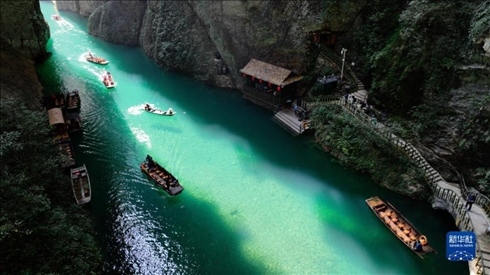 秋日,湖北省恩施土家族苗族自治州鶴峰縣容美鎮(zhèn)屏山村屏山旅游景區(qū)吸引眾多游客。屏山旅游景區(qū)河水清澈見(jiàn)底,舟行水上如懸浮空中,美如畫卷。