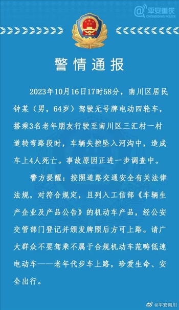 ·重慶警方通報(bào):老人駕駛無(wú)牌電動(dòng)四輪車搭載3名老年朋友失控墜河,4人死亡。