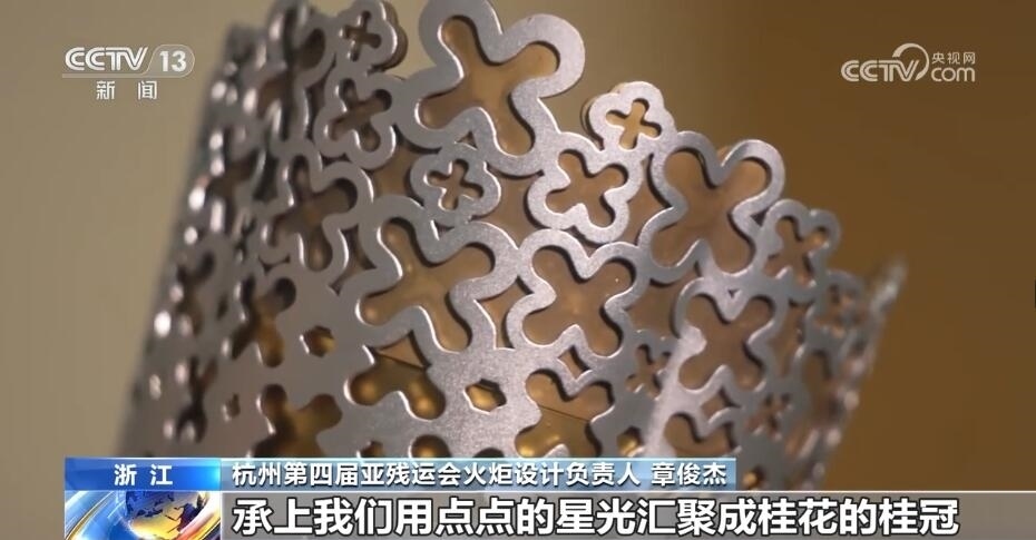 這就是火炬“桂冠”,它的設(shè)計思想源自良渚玉琮和杭州市花“桂花”。