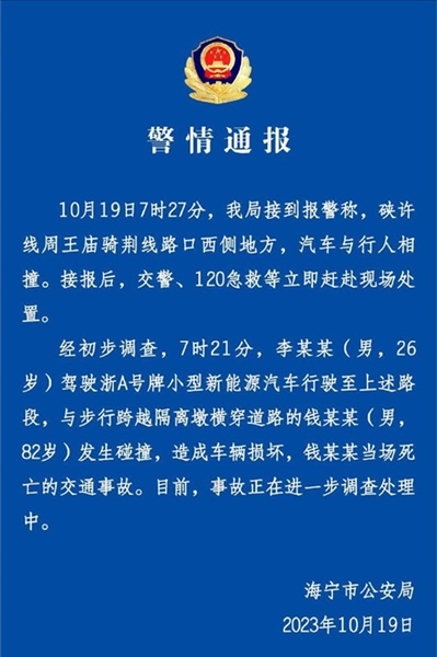 ·浙江海寧82歲老人橫穿馬路被撞身亡,警方通報:事故正在進一步調(diào)查處理。