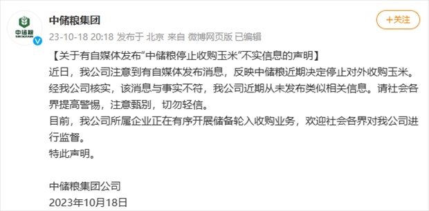 ·中儲糧集團辟謠停止收購玉米:近期從未發(fā)布類似相關(guān)信息。