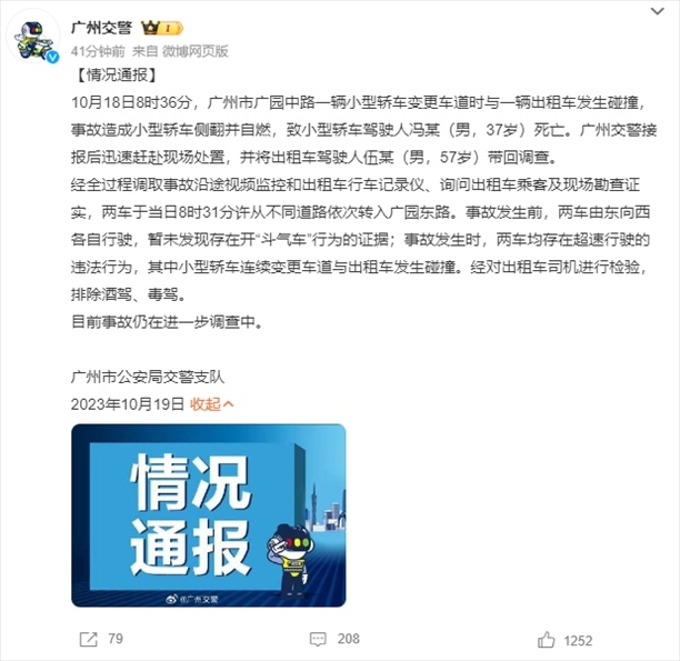 ·廣州交警通報寶馬車與出租車發(fā)生碰撞后撞上橋墩起火、駕駛?cè)怂劳鍪录簝绍嚲?、未發(fā)現(xiàn)開“斗氣車”。出租車所屬公司發(fā)聲:司機已盡力剎車,但確實存在超速。