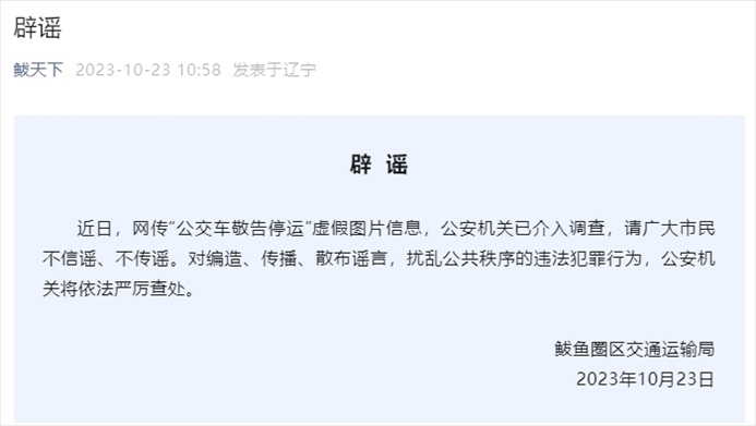·網傳“公交車敬告停運”,遼寧營口鲅魚圈區(qū)交通運輸局辟謠:系虛假圖片,公安已介入。