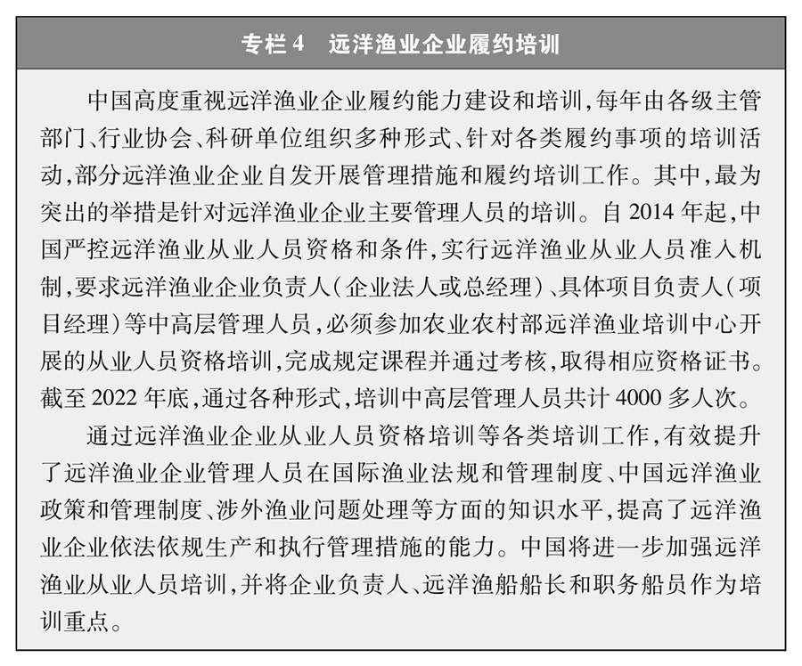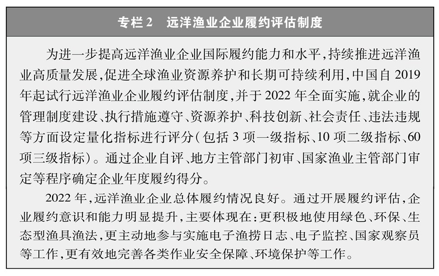 遠洋漁業(yè)企業(yè)和漁船是履行國際公約、合法合規(guī)從事漁業(yè)生產(chǎn)的主體。2022年中國正式實施遠洋漁業(yè)企業(yè)履約評估制度,將企業(yè)履約成績與行政審批、政策支持等掛鉤,通過正向激勵、反向倒逼的方式,引導企業(yè)不斷完善管理制度,嚴格執(zhí)行管理措施,避免發(fā)生違規(guī)行為,切實提高履約能力。這一制度有力促進了遠洋漁業(yè)企業(yè)規(guī)范管理和國際履約,得到了各方關注和廣泛認可。