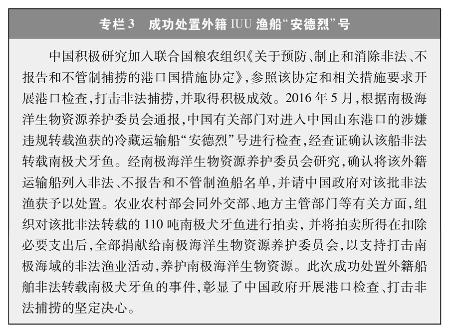 堅決支持并積極配合國際社會打擊各種非法漁業(yè)活動。2020年起,中國每年派遣執(zhí)法船赴北太平洋公海開展?jié)O業(yè)執(zhí)法巡航,查處違規(guī)作業(yè)行為。2016年,配合南極海洋生物資源養(yǎng)護委員會成功扣押處置了一艘外籍漁船非法轉(zhuǎn)載南極犬牙魚案件。2018年起,將中國加入的相關區(qū)域漁業(yè)管理組織公布的非法、不報告和不管制漁船名單通報國內(nèi)各港口,拒絕此類漁船進港以及卸貨、補給、加油等活動。