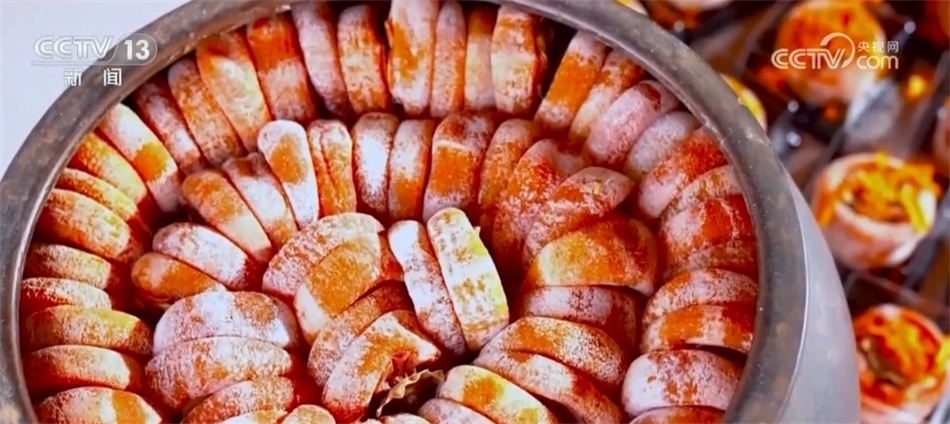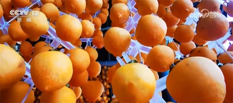 總臺記者 譚海梅:從削皮到吊掛到晾曬,這中間還得在經(jīng)過三次的“捏心”,讓這里面的糖分能夠很好地釋放,從霜降一直到冬至,富平柿子才會成為口齒留香的柿餅。