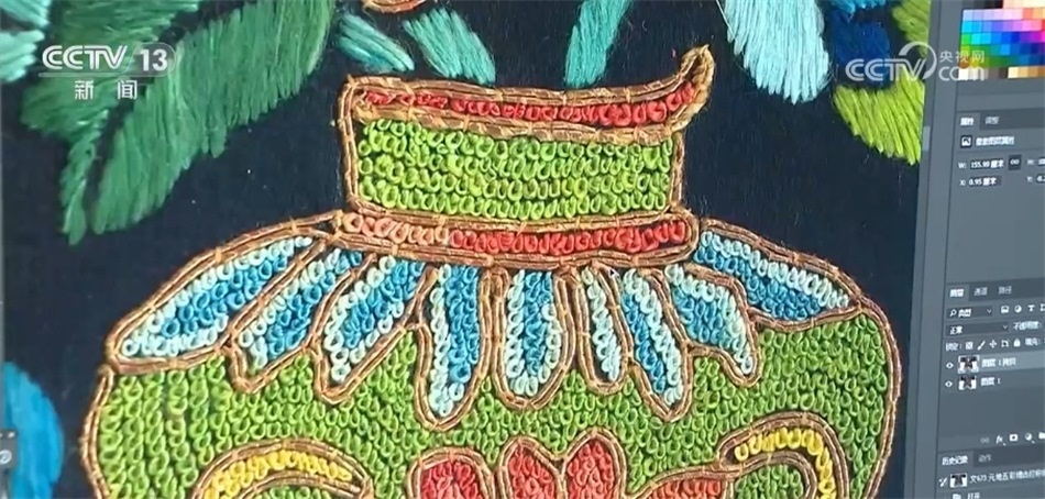 經(jīng)由高清設(shè)備采集、原樣分析、線圖提取,絲綢紋樣的圖案、色彩、針?lè)ā蛹?jí)都在電腦屏幕上一覽無(wú)遺。