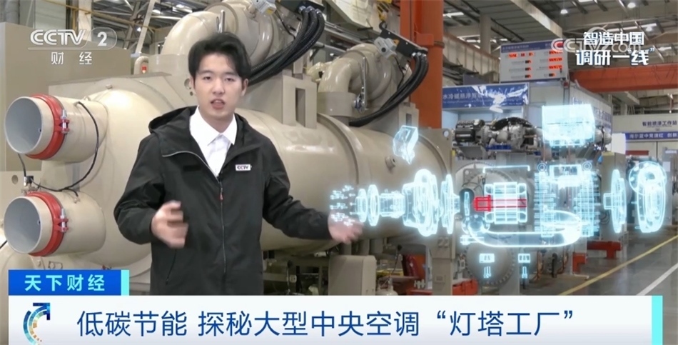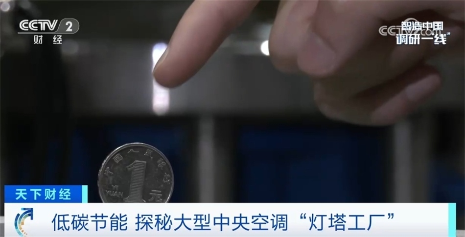 我現(xiàn)在走進的這個區(qū)域是空調(diào)產(chǎn)線的末端——檢測平臺。每一臺空調(diào)出廠前都要在這里經(jīng)過全方位的檢測。眼前這就是一臺正在運轉(zhuǎn)的氣懸浮中央空調(diào),我們在空調(diào)上立了一枚硬幣,可以看到是紋絲不動的,這也是氣懸浮的特點之一——運行比較平穩(wěn)。在這塊屏幕上顯示著空調(diào)的出水溫度7℃,恒定的出水溫度讓這臺空調(diào)產(chǎn)生的冷風(fēng)非常柔和。目前,這座工廠全流程的自動化生產(chǎn)能夠滿足從小型商用空調(diào)生產(chǎn)到用戶需求的大規(guī)模定制。目前低能耗、智能化產(chǎn)品已應(yīng)用在商業(yè)地產(chǎn)、酒店、軌道交通等各種場景,極大程度助力著國家“雙碳”政策以及各大行業(yè)的低碳轉(zhuǎn)型。