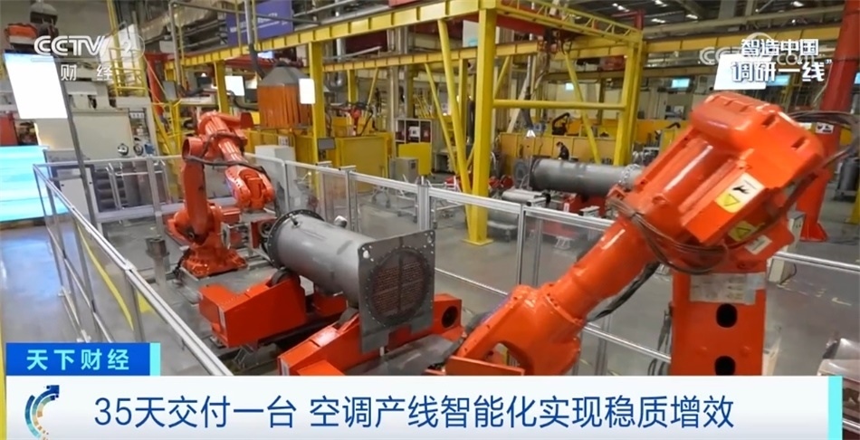 可以看到我身邊這條過道旁擺滿了產(chǎn)品,目前這家工廠所生產(chǎn)的中央空調(diào)處于訂單爆滿的狀態(tài)。生產(chǎn)一臺中央空調(diào)所需要的工序能夠達(dá)到上百道,目前這座“燈塔工廠”目前能夠做到最快35天交付產(chǎn)品,這與超級產(chǎn)線背后的智能化改造密不可分??照{(diào)主機下方的大型腔體,它內(nèi)部最多將安裝上千根換熱銅管,這些銅管與腔體之間沒有任何的焊接或黏合,是完全通過膨脹變形來完成固定與密封。這就意味著銅管安裝的好壞直接決定了這臺主機會不會泄漏制冷劑。目前這道工序已經(jīng)交由機械臂來完成,不僅安裝的時間由原來人工的兩個小時縮短至四十五分鐘,而且通過人工智能視覺檢測技術(shù),保障空調(diào)主機零泄漏。