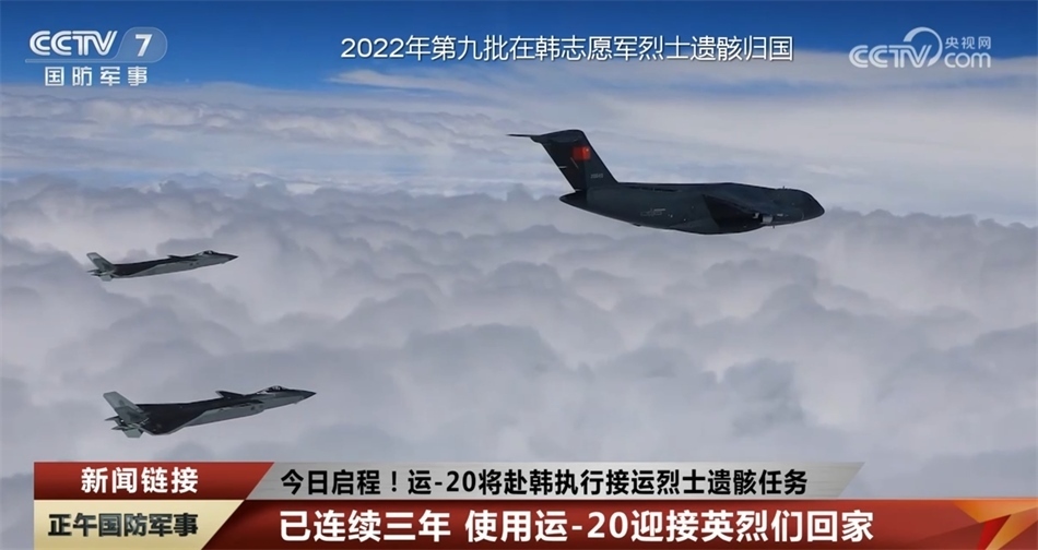2022年9月16日,我國從韓國接回第九批88位在韓中國人民志愿軍烈士遺骸。當(dāng)運(yùn)-20進(jìn)入我國領(lǐng)空后,兩架殲-20編隊(duì)護(hù)航,大國重器“雙20”列陣長空,告慰革命英烈。這是空軍首次以“雙20同框”的畫面接迎志愿軍烈士遺骸歸國。