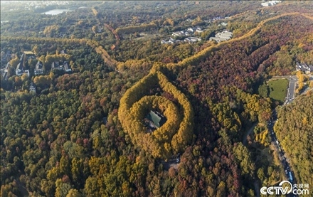 2023年11月19日,南京,初冬時(shí)節(jié)的鐘山風(fēng)景名勝區(qū)層林盡染,色彩斑斕。空中俯瞰被梧桐樹(shù)包圍的美齡宮,宛如一條“金色項(xiàng)鏈”,美不勝收。