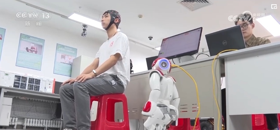 記者來(lái)到這間研發(fā)人形機(jī)器人的實(shí)驗(yàn)室時(shí),科研團(tuán)隊(duì)正在測(cè)試機(jī)器人的同步能力。眼前的機(jī)器人不僅可以通過(guò)攝像頭,捕捉人們的動(dòng)作后進(jìn)行同步模仿,還可以通過(guò)腦機(jī)接口、肌電交互等方式,捕捉人們的腦電信息和運(yùn)動(dòng)意圖,直接同步控制機(jī)器人的行為。