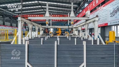 中交二航局常泰長江大橋項(xiàng)目部常務(wù)副經(jīng)理王輝:“傳統(tǒng)的橋塔鋼筋怎么做呢?通過吊機(jī)把鋼筋吊到塔上,作業(yè)工人一根根把鋼筋綁起來,個(gè)人能力有差別,質(zhì)量和精度,鋼筋間距也很難控制,現(xiàn)在我們采用什么理念呢?就是部品的理念,把塔的鋼筋在下面做成一塊一塊的,就像搭積木一樣,大型吊機(jī)把它吊上去,然后一節(jié)節(jié)堆起來?!?/p>
