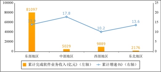 西部地區(qū)軟件業(yè)務(wù)收入小幅提升,中部地區(qū)增勢(shì)突出。1—10月份,東部地區(qū)完成軟件業(yè)務(wù)收入81097億元,同比增長13.9%,增速較前三季度回落0.2個(gè)百分點(diǎn);中部地區(qū)完成軟件業(yè)務(wù)收入5029億元,同比增長17.8%,增速較前三季度提高5.7個(gè)百分點(diǎn);西部地區(qū)完成軟件業(yè)務(wù)收入9889億元,同比增長10.2%,增速較前三季度提高0.3個(gè)百分點(diǎn);東北地區(qū)完成軟件業(yè)務(wù)收入2176億元,同比增長13.6%,增速與前三季度持平。四個(gè)地區(qū)軟件業(yè)務(wù)收入在全國總收入中的占比分別為82.6%、5.1%、10.1%和2.2%。