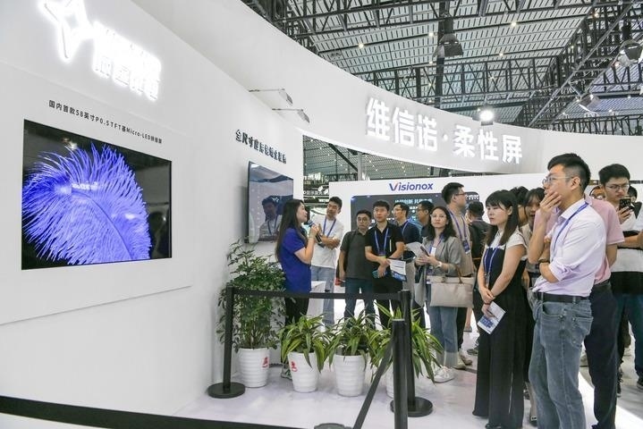 在“2023世界顯示產(chǎn)業(yè)大會(huì)新型顯示創(chuàng)新成果展”現(xiàn)場,觀眾在觀看58英寸P0.5TFT基Micro-LED拼接屏(2023年9月7日攝)。新華社記者 唐文豪 攝