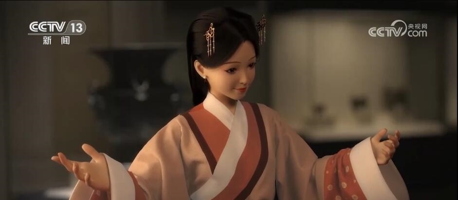數(shù)智人“艾雯雯”的形象設(shè)計(jì)凝聚著中國國家博物館館藏古代服飾的研究成果,數(shù)字編程設(shè)計(jì)者對中國女性容貌審美的領(lǐng)悟。身著素雅襦裙,紅色丹脂點(diǎn)唇,盡顯漢代女子的溫婉。今年11月,中國國家博物館文物活化利用新成果——中華文明云展試點(diǎn)上線,在“古代中國”展廳,她作為一名虛擬數(shù)智人與館藏文物產(chǎn)生神奇感應(yīng),獲得了讓“文物活起來”的獨(dú)特能力,驚艷全場。