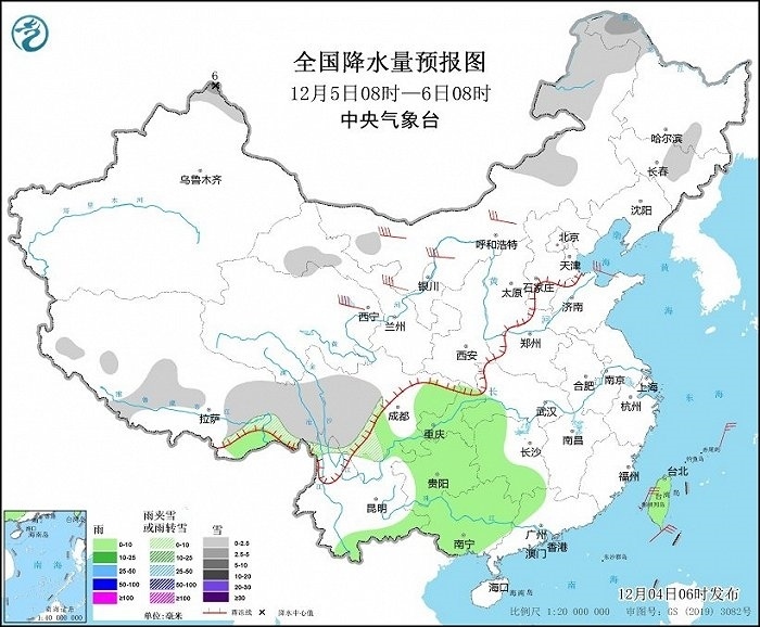 圖1 全國降水量預報圖(12月4日08時-5日08時)