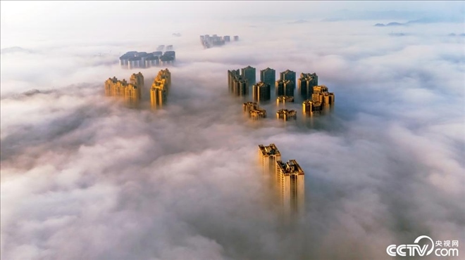 2023年12月4日,四川資陽(yáng)安岳縣城區(qū)云霧繚繞,高樓云霧中若隱若現(xiàn)。