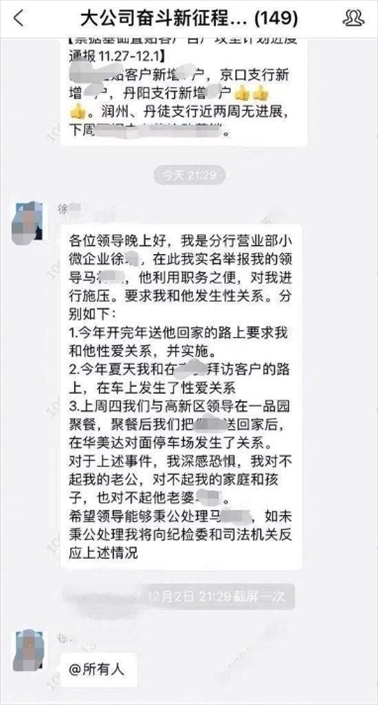 ·江蘇銀行鎮(zhèn)江分行回應(yīng)女員工舉報(bào)被領(lǐng)導(dǎo)施壓發(fā)生性關(guān)系:已免去馬某團(tuán)隊(duì)經(jīng)理職務(wù)。