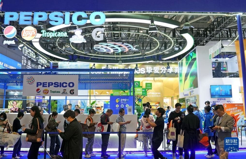 2023年11月8日在第六屆進(jìn)博會食品及農(nóng)產(chǎn)品展區(qū)拍攝的百事公司展臺。今年是百事公司首次參展進(jìn)博會。新華社記者 劉穎 攝