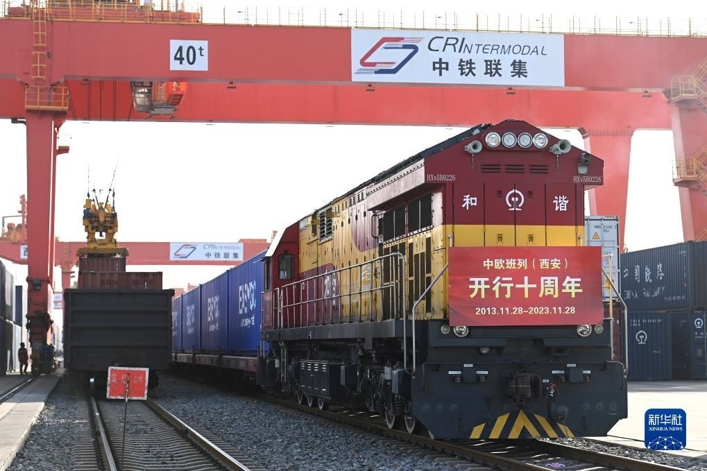 2023年11月28日,X8155次中歐班列在西安國際港站等待出發(fā)。新華社記者 鄒競一 攝