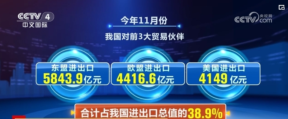同時,對部分傳統(tǒng)市場貿(mào)易也出現(xiàn)積極變化。我國對前三大貿(mào)易伙伴東盟、歐盟、美國分別進出口5843.9億元、4416.6億元、4149億元,合計占我國進出口總值的38.9%。11月當月,中美貨物貿(mào)易同比增長2.7%,結(jié)束連續(xù)6個月的同比下降,環(huán)比增長4.3%。