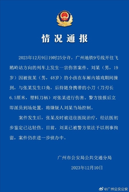 ·警方通報“廣州地鐵9號線持刀傷人事件”,廣州地鐵回應:涉案刀具不在管制范圍內(nèi)。