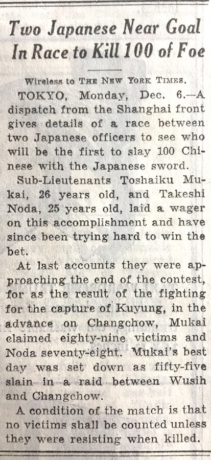 在1937年12月6日發(fā)行的《紐約時報》中,也登載了有關(guān)日軍“百人斬”殺人競賽的報道。報道稱,來自上海前線的一份電報詳細(xì)介紹了兩名日本軍官之間的一場比賽,看誰先殺死100名中國人。年紀(jì)分別為25歲和26歲的日本軍官把賭注壓在了這項“成就”上。
