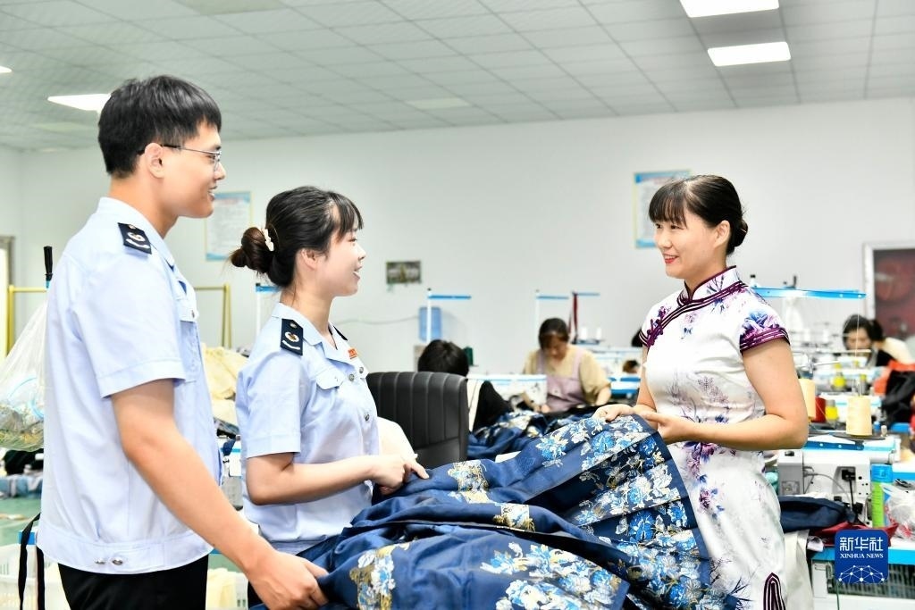 在山東曹縣辰霏服飾有限公司,曹縣稅務局的工作人員上門走訪,介紹減稅降費助企發(fā)展相關優(yōu)惠政策(2023年7月6日攝)。新華社記者 郭緒雷 攝