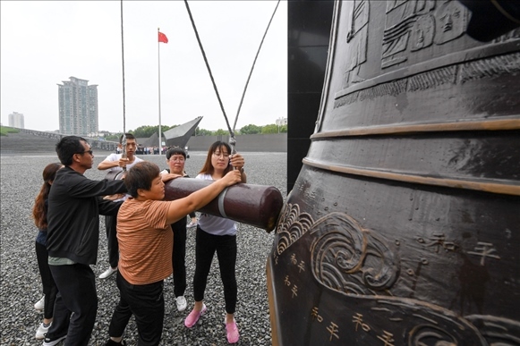 2019年9月3日,人們在侵華日軍南京大屠殺遇難同胞紀念館撞響和平大鐘。 新華社記者李博 攝