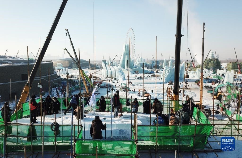 12月12日,在黑龍江省哈爾濱市冰雪大世界建設(shè)現(xiàn)場,工人在零下20多攝氏度的低溫下施工作業(yè)(無人機(jī)照片)。