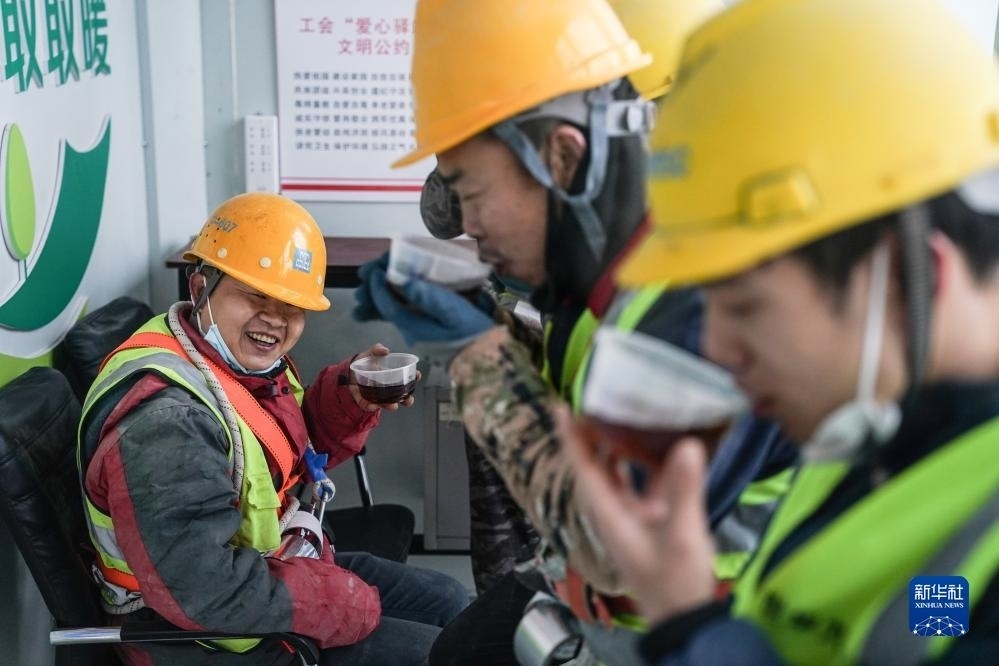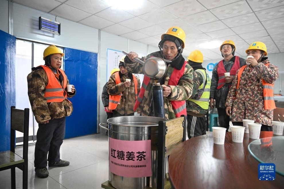 12月12日,在中建二局北方公司天津泰康項(xiàng)目工地,工人在飲用為他們準(zhǔn)備的紅糖姜茶驅(qū)寒。