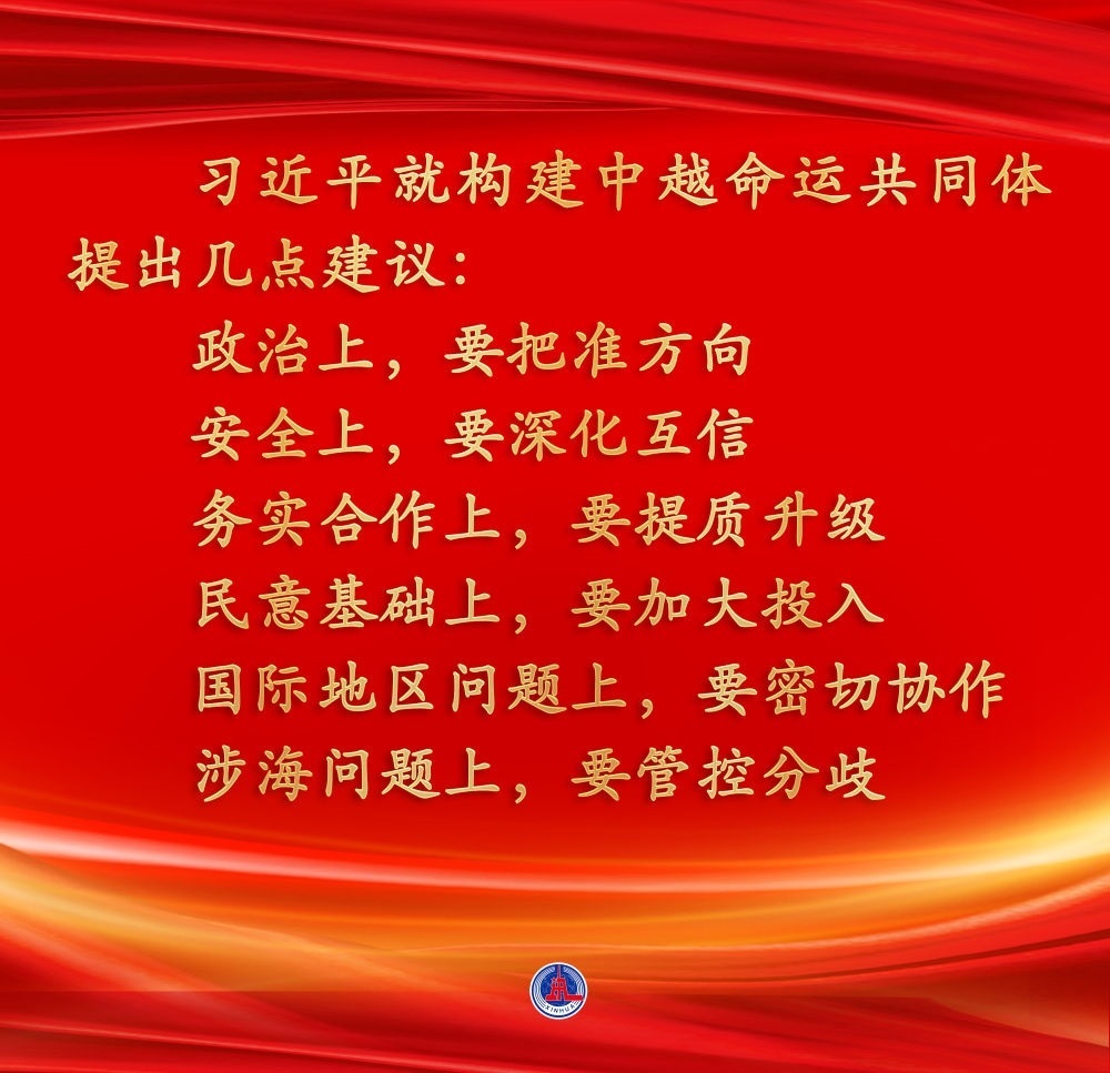 當(dāng)?shù)貢r(shí)間12月12日下午,剛剛抵達(dá)河內(nèi)的中共中央總書記、國家主席習(xí)近平在越共中央駐地同越共中央總書記阮富仲舉行會(huì)談。雙方宣布中越兩黨兩國關(guān)系新定位,在深化中越全面戰(zhàn)略合作伙伴關(guān)系基礎(chǔ)上,攜手構(gòu)建具有戰(zhàn)略意義的中越命運(yùn)共同體。